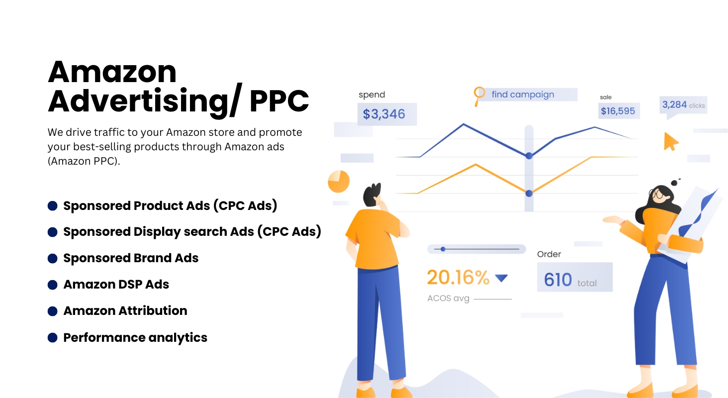 We initiate with a discussion about your current situation, your goals, and your timeframes. During our discovery call, we learn about your products and troubles you are facing. Once we know what you want, we will be your Amazon partners to level up your Amazon business through a monthly payment package or one-time projects.